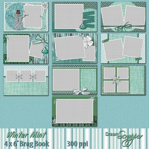This beautiful 4 x 6” Brag Book has been created from the “Winter Mint Page Kit,” by DreamScrapper. The faded greens, teals, and blues in this brag book are reminiscent of snow-covered evergreens and blue spruce. It is the perfect thing for last minute holiday gifts! Simply place your photos on a layer below the transparent openings, add your titles and journaling and save! The ten pages in this brag book have been created at 300ppi, 4 x 6 inches in size, and saved as png files to preserve transparency. For even more variety, be sure to check out the Winter Mint papers, elements, and alpha available separately or in the Winter Mint Page Kit. Special thanks to Monica Larsen, Rose.li Padoveze and Miranda Reinhardt.